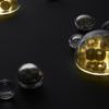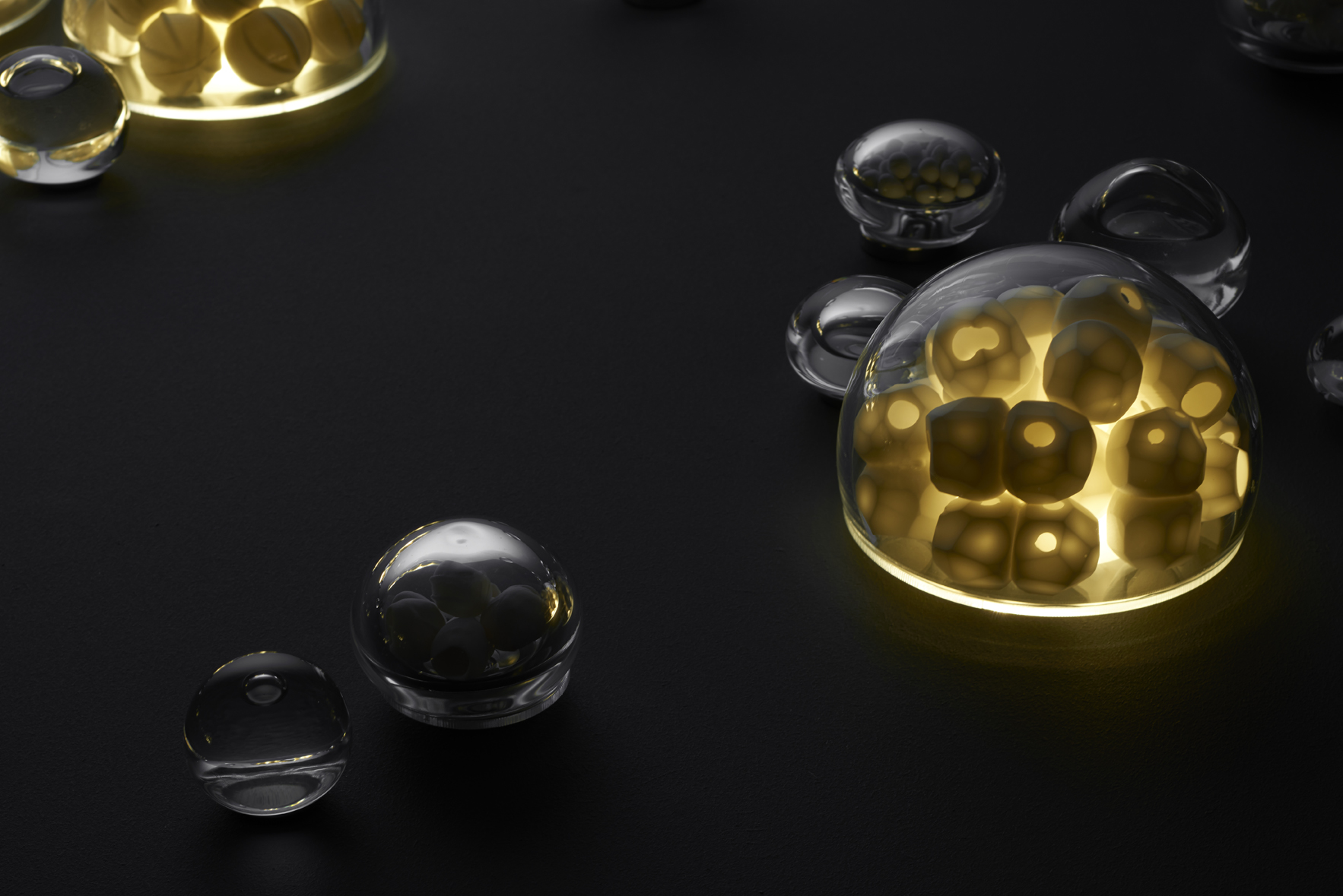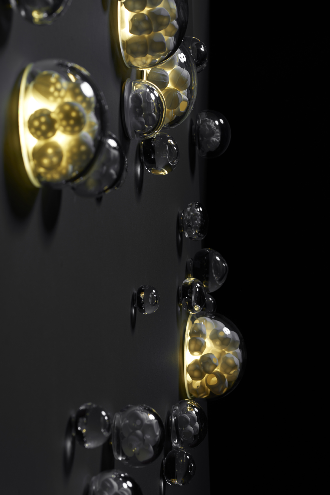 âDive inâ is light wall installation where glass bubbles run across the wall mimicking the way bubbles underwater rise the surface of the sea. The glass bubbles are filled with ceramic forms that emulate forms and textures of underwater creature. This installation comes bespoke so that clients can commission it to their own specifications.
